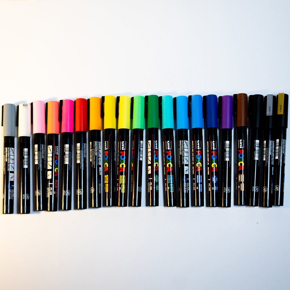 I found these pens neatly standing in a metal container on my desk. I was gifted them, after stealing my sister’s Posca pens on a trip home after my first year of college. I was excited immediately, imagining all the possibilities of coloring, drawing, and writing in ways I hadn’t explored before. Over the years, they’ve remained a staple in my creative bursts. They’ve been used on paper, canvas, and even a few spontaneous projects.